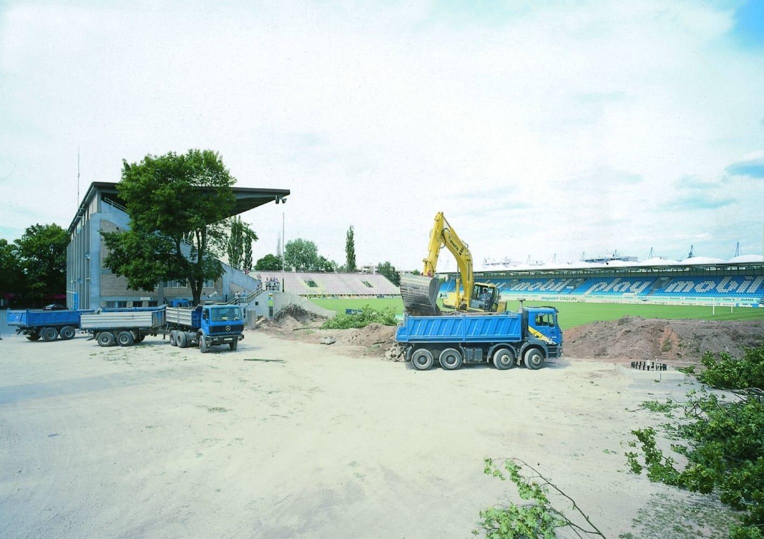 Ab dem 12. Mai 1997 wurden die Erdwälle im Norden abgebaggert, und so erkämpfte die Mannschaft den Aufstieg auf einer Baustelle. 3000 Menschen feierten die Rückkehr in die Zweite Bundesliga unterm Rathausbalkon, am Laubenweg wurden in kurzer Zeit die Gegengerade und die Nordtribüne, anfangs ohne Dach, hochgezogen. Die Haupttribüne wurde ebenfalls renoviert.