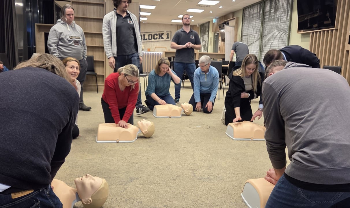 Im praktischen Teil der Schulung arbeiteten die Teilnehmer mit modernen elektronischen Trainingspuppen, die eine realitätsnahe Herzdruckmassage ermöglichten. Jede Kompression wurde digital ausgewertet und direkt auf einem Bildschirm angezeigt. So konnten die Teilnehmer unmittelbar erkennen, ob sie mit der richtigen Tiefe, Frequenz und Kraft arbeiteten. Zum Abschluss sorgte ein interaktives Rennspiel für zusätzliche Motivation: Jede Person steuerte ein virtuelles Auto, dessen Geschwindigkeit sich aus der Qualität der Herzdruckmassage ergab.