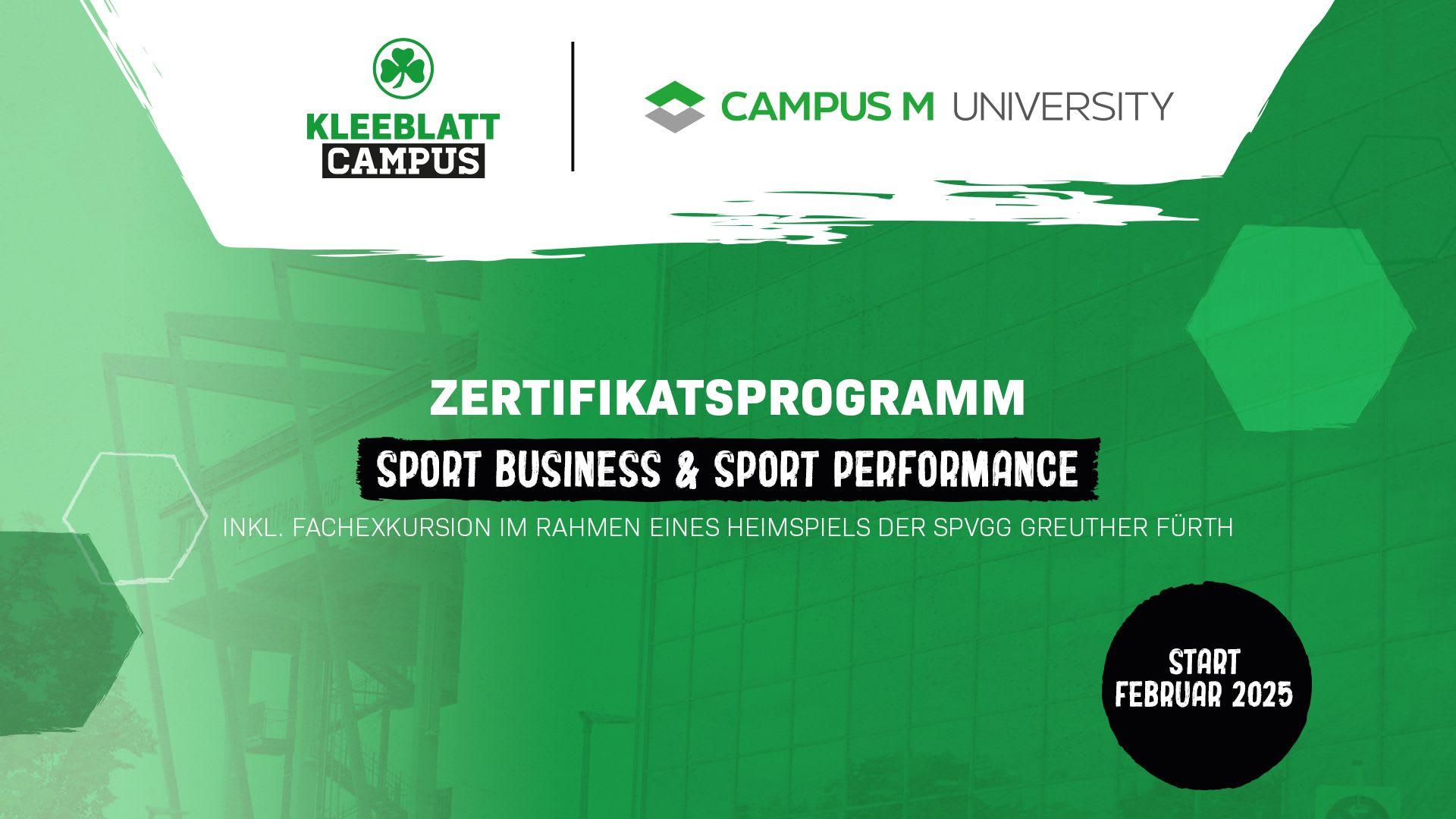Der Kleeblatt Campus der SPVGG GREUTHER FÜRTH und die Campus M University haben das exklusive Zertifikats- beziehungsweise Micro-Studienprogramm „Sport Business & Sport Performance“ entwickelt, das erstmals im Frühjahr 2025 angeboten wird. Die sechs Module umfassende Seminarreihe gibt Einblicke in das Management von (Profi-) Sportorganisationen und in die direkte Arbeit mit Athletinnen und Athleten und richtet sich an eine breite Zielgruppe.