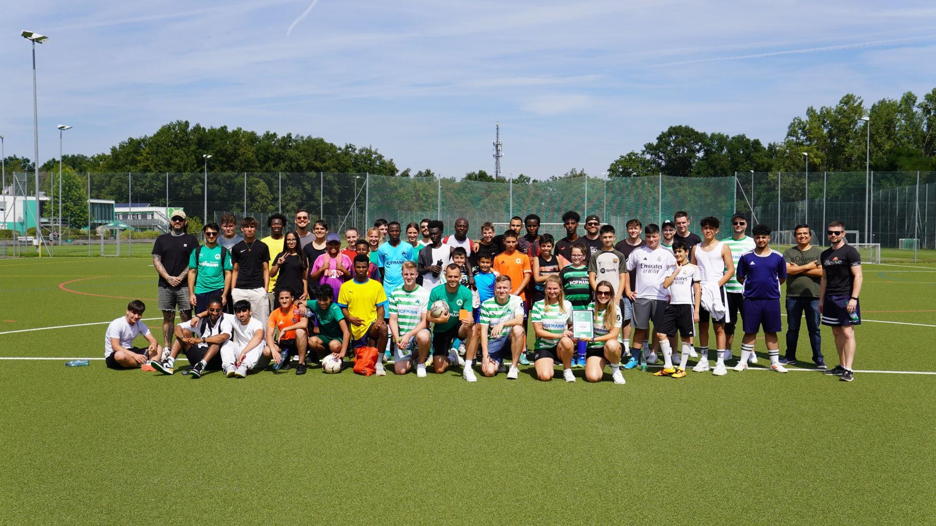 Nachdem alle Mannschaften gegeneinander angetreten waren und die Platzierungen feststanden, gab es mit allen noch ein gemeinsames Foto und Urkunden für die Kids. Tobias Wachtler durfte als Vertreter der Einrichtung außerdem eine Spendenurkunde über 1000 Euro von der Stiftung Kleeblatt fürs Leben für das KJHZ entgegennehmen.