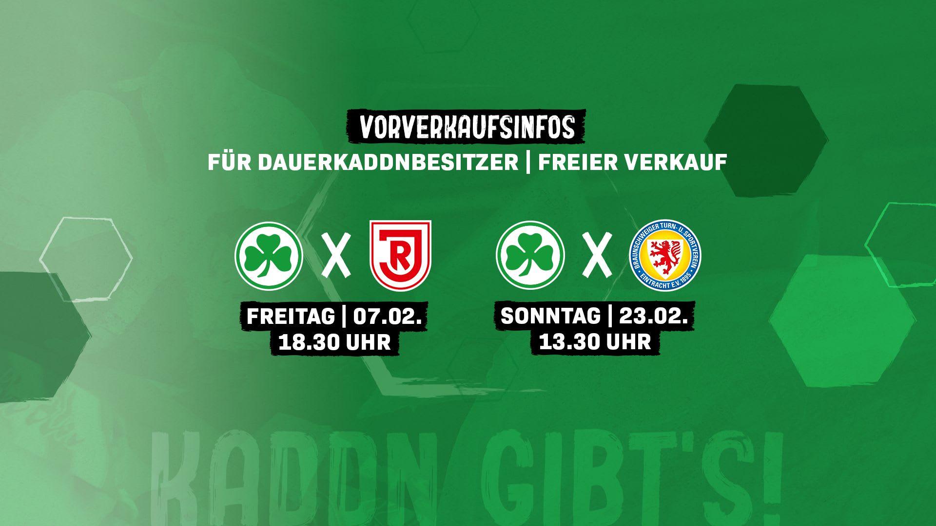 Die Karten für beide Partien sind im freien Verkauf ab Mittwoch, 15. Januar (10.00 Uhr) im Onlineshop, im Sportheim und bei Franken Ticket erhältlich. Dauerkartenbesitzer haben am Dienstag, 14. Januar (ab 10.00 Uhr), ein Vorkaufsrecht auf zusätzliche Tickets.