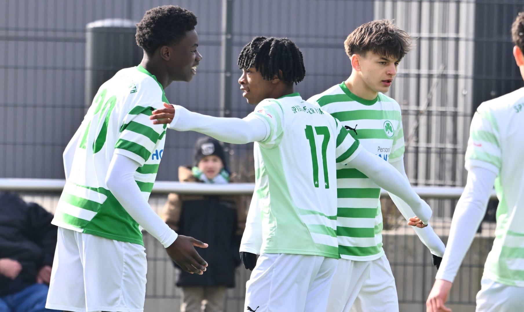 Dritter Sieg im vierten Spiel für die Fürther U19 in Liga B der Hauptrunde. Lange lagen die Fürther in Elversberg zurück, belohnten sich aber in der 77. Minute mit dem Ausgleich durch Jonas Valentin, ehe Silas Mann spät in der Nachspielzeit den Siegtreffer erzielte - und im Anschluss von einer grünen Jubeltraube nahezu erdrückt wurde. "Wir waren von Anfang an sehr gut im Spiel, hatten das Spiel aus meiner Sicht im Griff", sagte Trainer Roberto Hilbert hinterher. Nach einem Konter und mit der ersten richtigen Chance gingen aber die Hausherren in der 31. Minute in Führung. "Wir hatten auch danach das Spiel im Griff", erklärte Hilbert und nannte es deshalb "folgerichtig", dass sein Team das Spiel noch zu seinen Gunsten drehte. Mit der Entwicklung seiner Truppe ist der 40-Jährige zufrieden. "Wir haben uns vorgenommen, dass wir stabiler werden, das haben wir bis jetzt ganz gut hinbekommen. Das gilt es jetzt, über die ganze Runde konstant hinzubekommen."